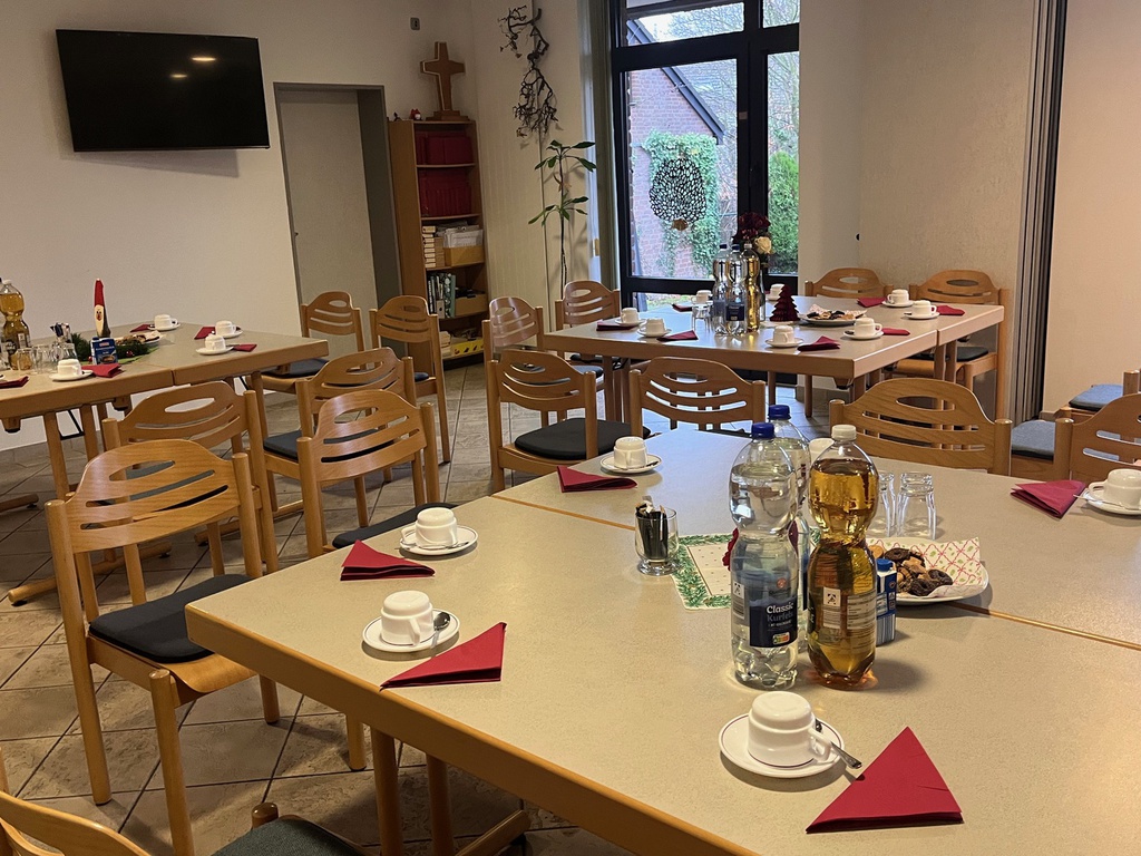 Was für ein schöner Vormittag! Dank "De Kull" konnten wir zwei Bussen nach Viersen Dülken fahren und die Gäste des Hospizes überraschen. Im Wohnzimmer des Hauses war alles gemütlich eingedeckt und warmer Kakao wartete schon auf uns. Die Kinder brachten bunte Laternen mit und ihre Stimmen. Zu Gitarre und Geige wurden Martinslieder gesungen, so dass alle Bewohner auf ihren Zimmern ein wenig Martinsstimmung abbekommen haben. Ein gesponserter Weckmann der Firma "Food & Beverage" wurde gemeinsam gemampft und zum Schluss kamen sogar einige der Gäste zu uns an den Tisch. Da wurden sich Lieder gewünscht, wie "Pippi Langstrumpf", "Der Herbst, der Herbst, der Herbst ist da" oder auch "In der Weihnachtsbäckerei".