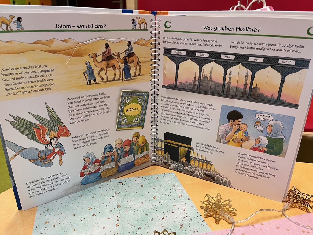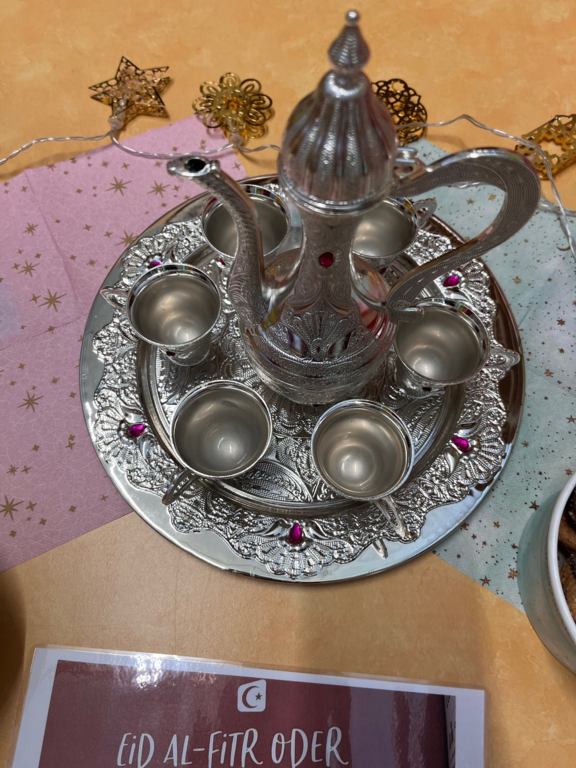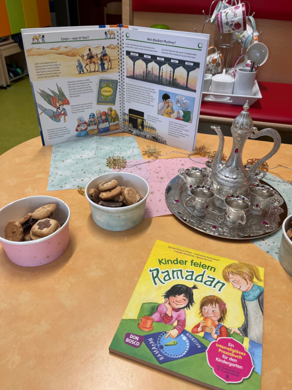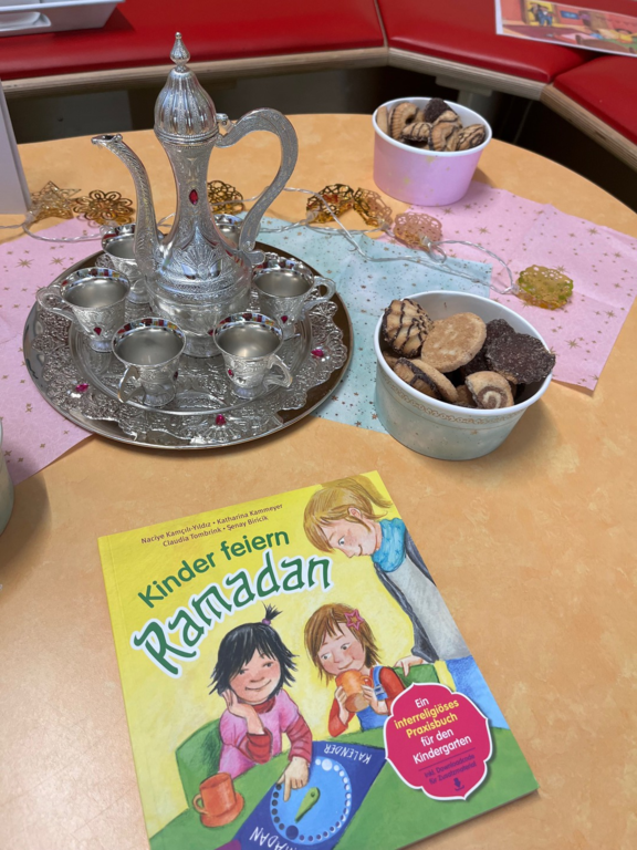 Unser Eltern Cafe war heute geschmückt zur Feier des Tages für alle muslimischen Familien, es gab Bücher zum Thema Zuckerfest und den größeren Religionen, es gab Süßigkeiten und